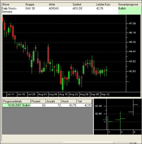 Es muss nicht immer intraday sein ! Mit dem richtigen Handelssystem können Sie mit wenig Zeitaufwand auch auf der Basis von Schlusskursen profitabel agieren. Das erste Beispiel zeigt anhand der ADIDAS-Aktie, wie am 18.09.2007 aus einem Seitwärtstrend für den Folgetag ein gewinnbringender Kursanstieg prognostiziert wurde. |