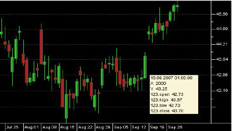 - Below: The daily high was actually higher at 43.87 and the low at 42.73, so expectations were even exceeded that day. But even better, this was only the beginning of a much longer upward movement, having started spontaneously from a sideward trend.