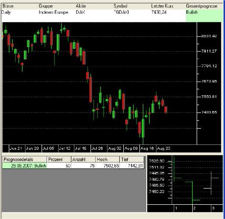 Why always intraday ? The right trading tool allows you to make very profitable trades based on end-of-day rates with very little effort ! The first example shows the successful prognosis of a rising price for the next day for the ADIDAS stock arising from a sideward-trend on 18. September 2007.