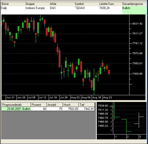Beim Handel mit dem DAX ist das richtige Timing der wichtigste Parameter, damit Sie auf der Gewinnerseite des Trades stehen. Ihre Gegner sind Stress und emotional bedingte Fehlentscheidungen. Mit klaren Regeln, so wie sie in den Handelsempfehlungen von VECTORBULL implementiert sind, können Ihnen end-of-day Trades wie die im Beispiel (August 2007) gezeigte Mitnahme von sagenhaften 255 DAX-Punkten am Stück gelingen. |